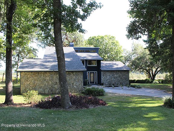 Beautiful setting in Dogwood Heights, right next to the Brooksville Country Club. Contemporary design like a mountain chalet overlooking a rolling tree farm. Stone, floor to ceiling, fireplace in Great Room with soaring ceilings and a loft. 2 bdrms and a full bath downstairs. Upstairs is a spacious master suite with private balcony, double vanity and large walk in closet. Open kitchen with granite countertops and stainless appliances. Oversized 2 car garage. Wonderful privacy on almost 3/4 of an acre of beautiful trees. The large outdoor deck overlooking farm land is perfect for enjoying the spectacular Florida weather. Location of home provides a wooded view across the street and long range views out the back. New roof in 2018. New water heater in 2021.