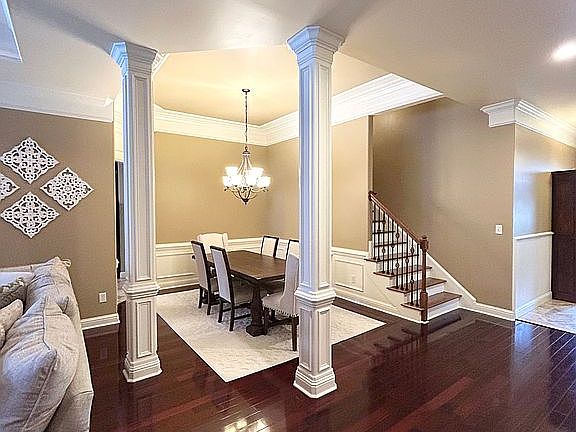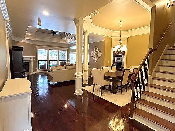 Step inside to find beautifully engineered hardwood floors that flow through the dining and living areas, complemented by an open floor plan defined by graceful columns. The spacious kitchen is a chef’s delight, featuring vaulted ceilings, custom cabinetry, granite countertops, stainless steel appliances, and a convenient breakfast bar.