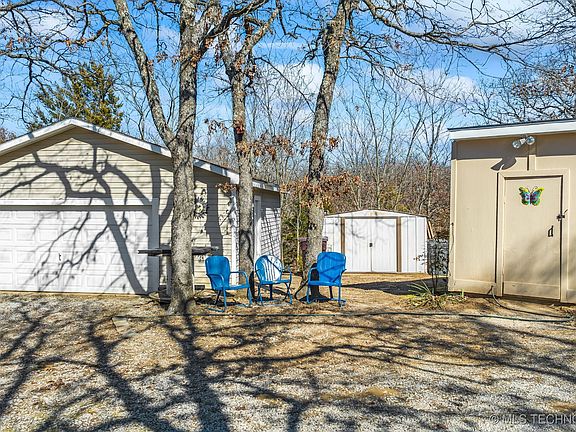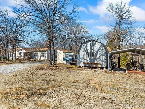 Here's your checklist: Excellent condition double wide with individualized floor plan, concrete beam foundation on 6 m/l beautiful wooded acres. Home has two possible masters with private baths, a 3rd bedroom and 3rd bath; an extra room off the kitchen for living, office, exercise or 4th bedroom possibility. Out buildings include an over-sized garage, carport, shop, shed and storm cellar. Lovely, relaxing fishing pond just off the back deck. Secluded but convenient to HWY 20, Skiatook Lake and town.