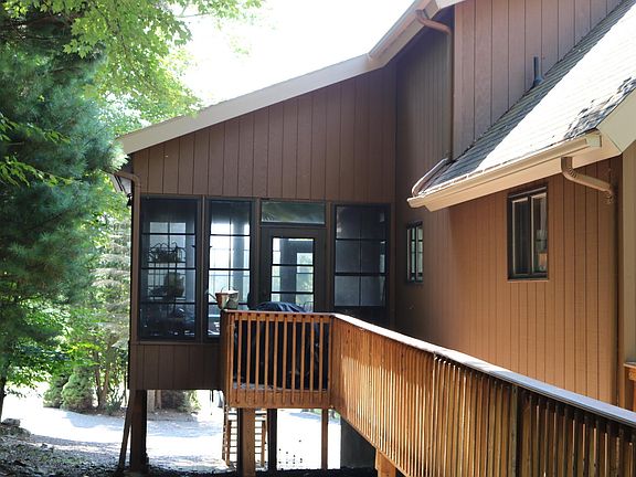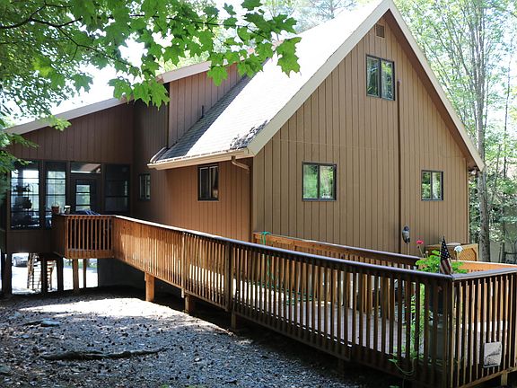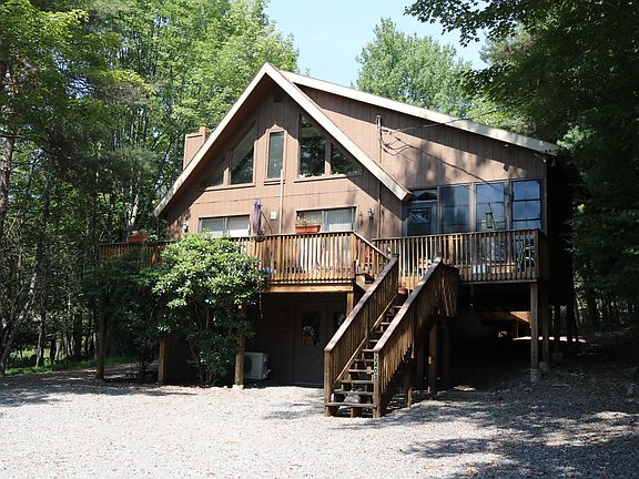 True Mountain Chalet home with Lake views! This bright, airy, and open resort community home has all the features one would expect from a Pocono lake community home! Vaulted ceilings, open floor plan, real wood fireplace, lake views and access to all the amenities The Hideout has to offer! Pools, beaches, lakes, ski hill, golf course, gaming courts, pub, restaurant, fitness center, game room, walking trials. Oh my!