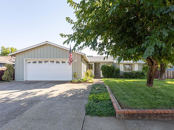 MOVE IN READY in appealing location with a shaded COVERED PATIO in the PM! FRESHLY PAINTED EXTERIOR & A NEW ROOF IN 2020. Hardwood floors newly refinished in bedrooms, also under the carpet in the good sized living room, dining and hall. Large kitchen, extra cabinets & room for a work space or freezer. Enjoy CENTRAL AIR & HEATING and natural GAS INSERT in the fireplace. Fenced garden area with fruit trees. Walking trails at Clover Creek nearby. Room for RV parking area (on the south side). Two car garage with evaporative cooler, laundry sink, washer & dryer included. Automatic sprinklers front & rear. Two garden sheds. New primary electrical panel in the garage.