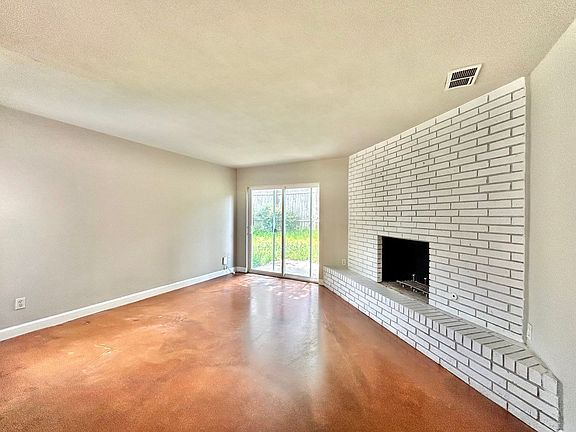 Step into style and comfort in this beautifully updated single-level home featuring sleek stained concrete flooring throughout the main living areas and cozy carpet in the bedrooms. The open-concept layout includes a spacious living room with a classic white brick fireplace, perfect for relaxing evenings.