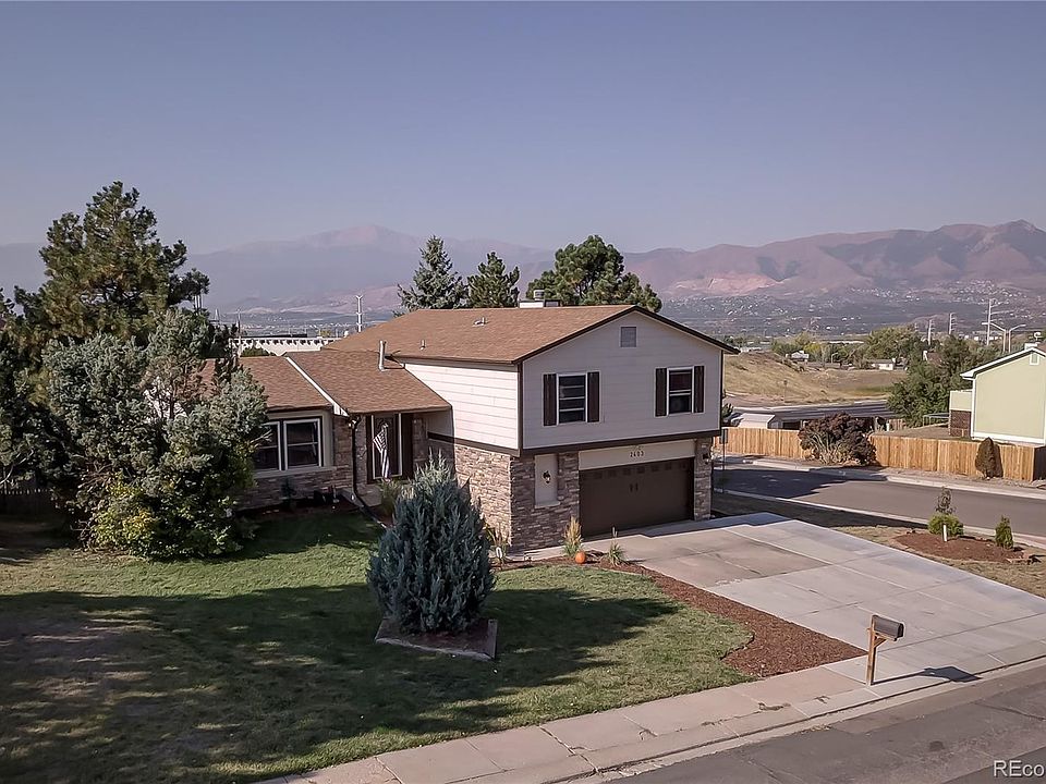 Welcome to the perfect family home in the heart of Briargate! This corner lot, 3-bedroom, 2.5 bath home features formal living room, formal dining room & eat-in kitchen, which boasts newer stainless appliances & granite countertops & overlooks the lower level family room with cozy wood-burning fireplace and walk-out to multi-level decks in the fenced back yard! This level features a wet bar, and could easily be converted into an extended family living space. Beautiful hardwood flooring. Upper level office could become your 4th bedroom! The basement is finished into the ultimate man cave, and could be a 5th bedroom! Open floor plan. Sunken hot tub. The west-facing backyard offers stunning Pikes Peak and Front Range views from anywhere on the 2-tier decks. Fully landscaped, large corner lot with new sprinkler system, fenced back yard! Newer A/C, furnace and humidifier - new exterior paint. Custom, oversized garage has cut-out area for workbench, tools or storage! Prime Briargate location puts you close to schools, shopping & dining, with easy access to I-25.