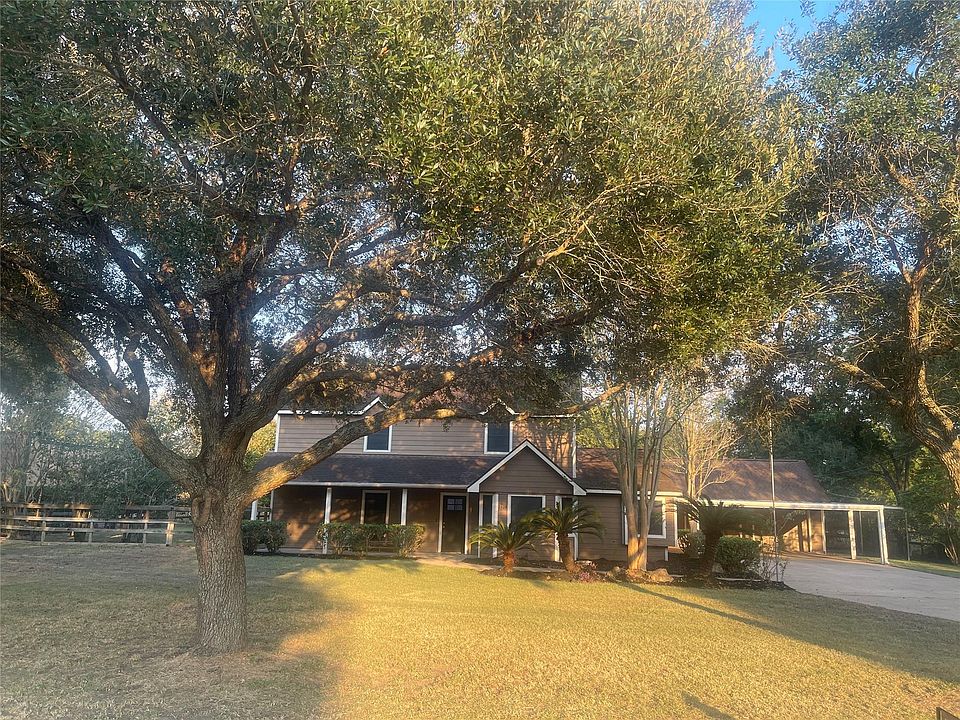 Nestled on over an acre of land, this inviting 2-story home offers both charm and functionality in a peaceful, tree-filled setting. The spacious living room features a striking brick fireplace as its centerpiece, while the kitchen is designed to impress with gleaming stainless steel appliances, pristine white cabinetry, and generous counter space. The downstairs showcases easy-care laminate wood flooring, and the private primary suite includes a spa-like bath with dual sinks and a large walk-in shower. Outdoors, you’ll love the covered porches that are perfect for relaxing or entertaining while taking in the serene surroundings. The property is fully fenced and includes a detached garage with extra carport parking, a storage shed, and plenty of room for hobbies. With its blend of country appeal and close proximity to city conveniences, this home delivers the best of both worlds.