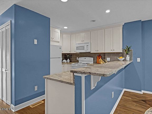 Gorgeous 3 bed, 2 bath condo at the south end of Kure Beach in the community of Ocean Dunes. Relax on the spacious deck to the sounds of the ocean with views of the majestic Live Oak trees. Just a short walk to the ocean, this recently updated 3rd floor home has it all. Beautifully appointed kitchen with granite countertops, ample cabinetry with soft-close drawers, tiled backsplash, breakfast bar and a pantry for additional storage; all overlooking the dining and living area. Just off the kitchen is a laundry closet with full size stackable washer and dryer. The primary bedroom offers sliding glass doors to the deck and an ensuite bathroom. Covered parking on the ground level with a storage closet. Access to the Ocean Dunes amenities includes, indoor and outdoor pool, tennis, basketball, shuffleboard, sauna, jacuzzi and a community room.