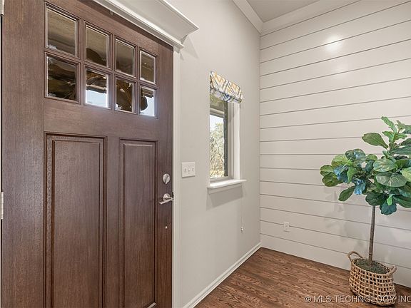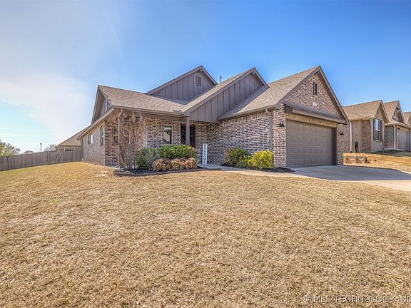 Quality built full-brick one level home in south Broken Arrow on a corner lot. Only 5 years old, feels like new. Upgrades include vaulted ceiling with suspended beams, real hardwood floors in all main areas, Jay Rambo soft-close cabinetry throughout, under-cabinet lighting, tiled walk-in shower with seamless glass door. Beautiful kitchen includes granite counters, stainless appliances including a gas range with microwave above plus corner granite composite sink, large center island and large pantry with barn doors. Generous sized laundry room with sink with access from bedrooms. Private primary suite doesn't disappoint with two separate walk-in closets and an attached bath with private potty room, double sinks and a large shower with bench & soap niche. No carpet in this house - all bedrooms have luxury vinyl wood-look plank flooring. Large backyard with covered patio and a covered porch on the front. Home is conveniently located just a little over a mile from the turnpike, movie theater, the new Reasor's plus a plethora of dining options.