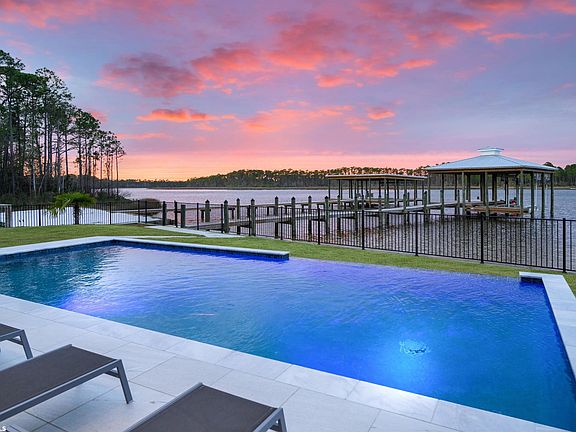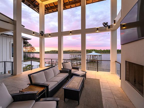 Simply Exceptional. Sophisticated, yet beautifully livable, this remarkable home is a testament to the art of fine design and gracious coastal living. From the stunning, unobstructed views of Wolf Bay to thoughtfully curated design elements, Grandview is an inviting oasis for living, relaxing and entertaining. The 2-story mosaic water wall welcomes you up to the second floor front entry with bay openings and floor-to-ceiling glass French doors for expansive views of the coastal landscape and adjacent natural preserves. Throughout the home, living spaces flow seamlessly from inside to the outside, each window offering its own picture.The spacious, open plan of the main floor includes the beautifully appointed living room, dining area and a chef kitchen, each with amenities to please all the senses. An indoor/outdoor seven zone wireless Sonos system provides sound and internet throughout the home. All the tile throughout the home was carefully selected to subtly reflect unique aspects of this area’s coastal heritage. Chef grade Decor’ appliances, an oversized quartz waterfall island, and temperature controlled Vintage View wine wall anchors the main living area. The Scullery, laundry and pet station are conveniently close by. The elegant primary bedroom suite offers waterfront views connecting to a luxurious ensuite bath with free standing soaking tub, walk-in shower with wirelessly controlled jets, floating vanities with wall mounted faucets. Upstairs offers 3 bedrooms with private baths, 2with balcony access and water views. A spacious covered back porch offers fireplace, summer kitchen with quartz countertop and inline gas grill. The saltwater, infinity edge pool has a convenient shower/water closet close by. Stroll the pier to the boathouse with a 5-ton lift and deep water access. Abundant storage in 2 ground level storage rooms and an oversized 2 car garage. Attention to detail in all aspects of this home are truly remarkable.