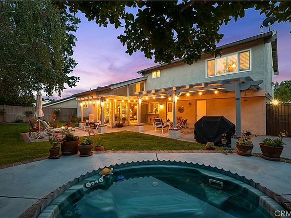 Welcome to this beautiful 4-bedroom, 3-bath home located in one of Valencia's most desirable neighborhoods! From the moment you arrive, you’ll notice the charming curb appeal, mature trees, and inviting front yard. Step inside to a bright, open floor plan filled with natural light, plantation shutters, and timeless finishes throughout. The open-concept kitchen flows seamlessly into the living and dining areas — perfect for both everyday living and entertaining. Enjoy the flexibility of a bedroom and full bathroom downstairs, ideal for guests, a home office, or multi-generational living. Upstairs, you'll find spa-inspired bathrooms with travertine stone finishes and a relaxing, elegant atmosphere. The home features zoned A/C systems and an upstairs whole-house fan, which pulls warm air up through the attic and out, naturally cooling the entire home while reducing electricity costs. Step into the private backyard to find your own private spa, ideal for unwinding after a long day. The two-car garage offers a workbench and abundant built-in storage, making organization a breeze. This sought-after community offers outstanding amenities, including a pool, clubhouse, tennis courts, pickleball, and basketball courts. This home is in the perfect location, just minutes from the freeway, top-rated schools, shopping, dining, and parks. Don’t miss the chance to own this immaculate move-in-ready home in one of Valencia’s most popular neighborhoods!