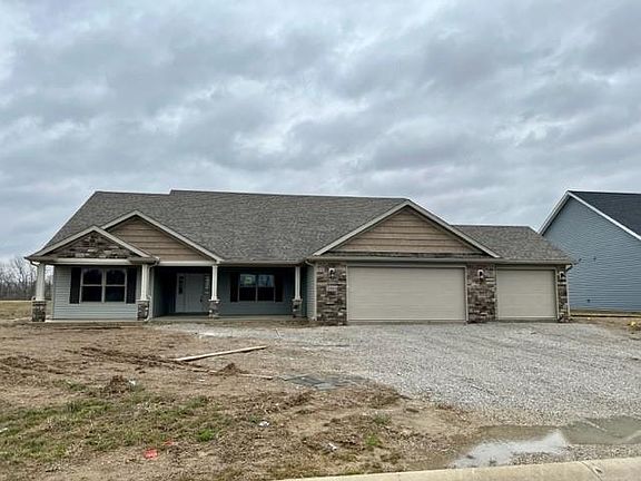 This stunning 4 bedroom, 2.5 bath home with over 2,000 square feet is now finished and ready to be called home. This open concept Legacy floorplan was built by Ideal Builders and is a beauty inside and out. One of the first things you'll notice is the gorgeous curb appeal that showcases the large covered front porch. Another great surprise is there a huge covered patio on the back of the home as well. Step foot into the spacious foyer and immediately off to the right is a flex room with double doors. This room meets the requirements to be a 4th bedroom, but you name its purpose. Would make a great den, office, toy room, man cave, etc. Spacious great room with chamfer ceilings and triple windows overlooking the pond. Very functional kitchen with upgraded hickory cabinetry and stainless steel dishwasher and microwave included in sale. Large 18x16 primary bedroom is on the east side of the home and has its own private full bath with extra tall vanity, 5' walk-on shower with rain showerhead, linen closet, and 6x11 walk-in closet with plenty of shelving and spaces for hanging. True split bedroom floorplan with bedrooms 2 and 3 situated on the west side of the home and both are great in size. Second full bath is centered between bedrooms 2 and 3 and also has a linen closet. When entering the home through the garage there is a half bath immediately to your right. On the other side of the hall is a coat closet as well as a cubby bench with shelf and hooks. Laundry room located beside the half bath. 2-car garage is 24x21 and has an extra wide (30") pull-down staircase to attic with flooring. There is also a 20x12 garage 3rd bay. 95% efficient HVAC system with Fresh Air Ventilation. Andersen Windows throughout home as well as rounded drywall corners. The view from the rear covered patio is truly beautiful and overlooks a pond. This home has the OPTION for homeowner to belong to the monthly lawn maintenance and snow removal program, but it is not a requirement. Should you want lawn maintenance and snow removal taken care of for you, it would be $125.00 per month.