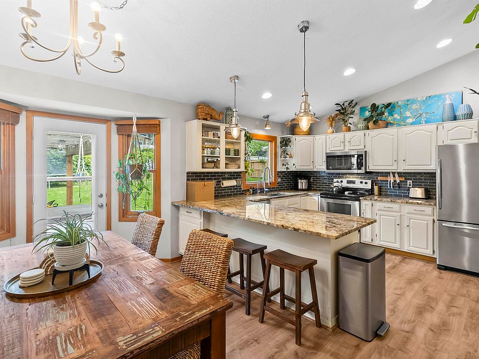 This charming 5-bedroom, 3-bathroom ranch-style home in the desirable Tuthill Highlands neighborhood offers a blend of comfort and convenience. Built in 1984, this residence boasts a generous 2,153 square feet of living space on a 0.29-acre lot. Spacious and updated interior: Enjoy a beautifully updated kitchen featuring updated stone countertops and tile backsplash, stainless steel appliances, and stylish decor. Updates extend to the bathrooms, including a heated floor in the lower-level bath. An oversized garage provides ample storage space and includes an attached heater.