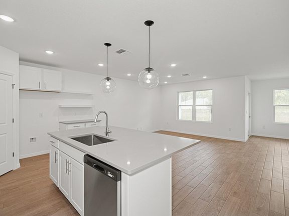 This great 4 BR; 2 Ba home with covered lanai and two car garage home offers an open floorplan.Welcome to the Goldenrod II, a beautifully designed home with a modern Loft look and the rare benefit of no HOA fees or regulations. This home offers a bright and spacious layout, highlighted by a stunning kitchen featuring White Aristokraft 42'' upper cabinetry, sleek Meridian Grey quartz countertops, and a large island perfect for gathering. Just off the kitchen, the intimate dining area opens to a covered patio, creating a seamless indoor-outdoor flow ideal for entertaining.The expansive great room provides plenty of space for relaxing or hosting guests, while plank tile flooring throughout the main living areas adds both style and durability. The luxurious primary suite offers a peaceful retreat with a generous walk-in closet. Enjoy outdoor living year-round on the covered patio, perfect for grilling or unwinding in the shade.