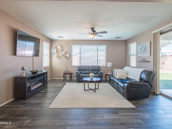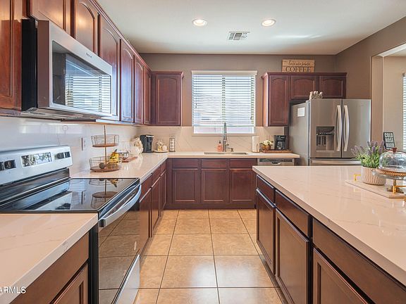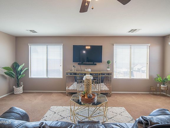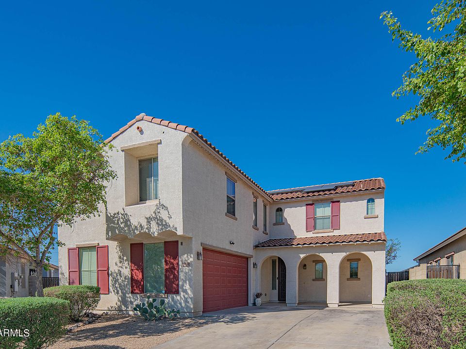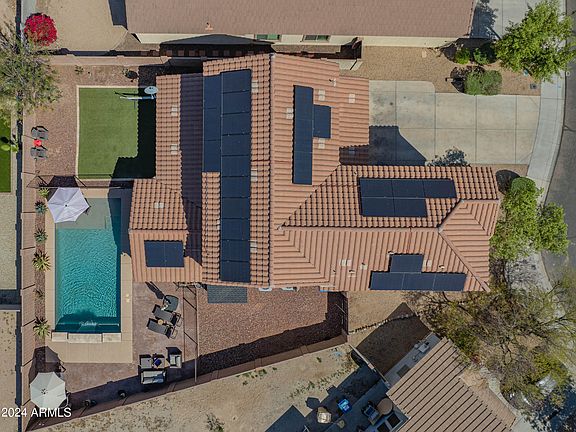 SOLAR PANELS OWNED! Multi-generational home with full guest/media suite downstairs. This impeccable home on an oversize lot has everything you need to both grow your family or care for other family members who may need to reside with you. Immaculately cared for with a large island kitchen, stainless steel appliances, Quartz countertops, upgraded hardware, faucets, lighting, upgraded tile and designer paint. All bathrooms have been partially upgraded with new hard ware and some lighting. Step outside to your desert oasis featuring turf, a fenced gorgeous pebble-tech waterfall pool baja shelf for the littles with stamped decking and RV gate for all your toys! Add to that the OWNED solar panels and low utilities...welcome to your dream home!.