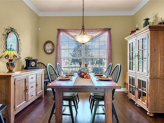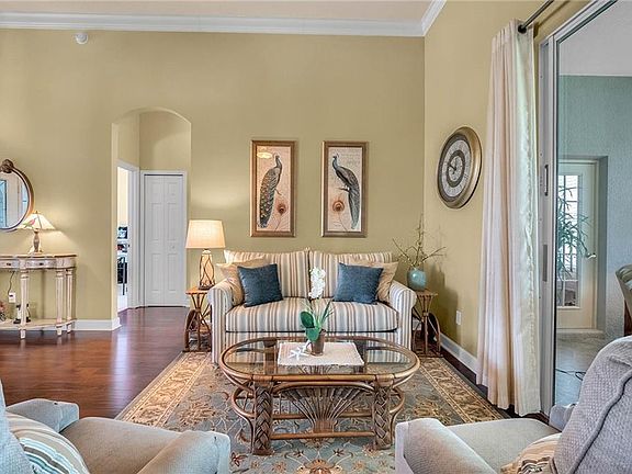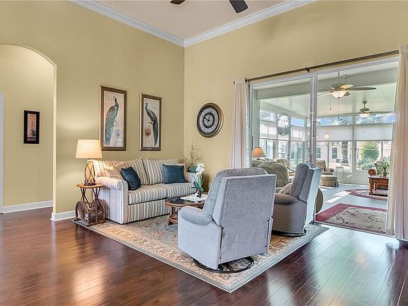 When you arrive to the 2 bed plus den 2 bath home you'll immediately be impressed with the lush landscaping and open green space on this oversized lot. Enter through a screened entry to over 2,300 square feet of well-appointed living space, with beautiful wood floors, arched entryways, crown molding and Florida sunshine filling the home. The kitchen includes Corian countertops, stainless steel appliances, tiled backsplash, eat-in bar with pendant lighting and adjacent breakfast nook. Extend your entertainment into the recently renovated and spacious Florida Room overlooking the beautifully landscaped backyard. The master suite includes a sitting area and oversized closet and the master bath with dual split vanity, cultured marble countertops and glass enclosed walk-in shower. The den can be used as a hobby room, office, or can be used as a third bedroom. Oversized garage with electronic screen has 2 pull downs for attic access that gives you plenty of storage. Located close to the south entrance for added convenience. The Plantation at Leesburg offers 24 hour guard gated security with endless amenities for 55+ residents. Three clubhouses and two 18-hole golf courses offer something for everyone. Amenities include 3 pool areas, hot tub, pickleball, a softball field with men and women's community teams, tennis, bocce ball, archery range, and much more. This community also features the Plantation Oaks Restaurant, so you can stay close for great food and drinks. Call now to schedule your showing!