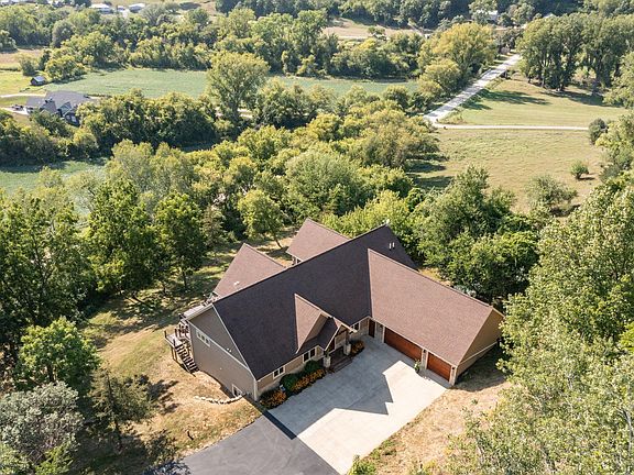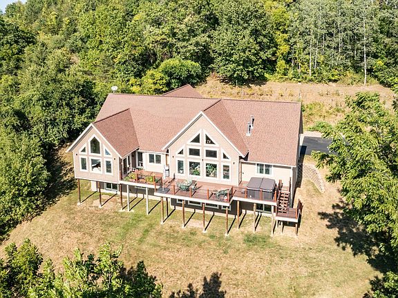 This absolutely stunning custom built walkout rambler perfectly nestled on 5 acres will captivate you the moment you arrive. The exquisite craftsmanship and serene setting set the tone to perfectly blend a casual lifestyle with sophistication. Soaring 24' ceilings and windows greet you as you enter, framing the picturesque panoramic views of the hillside; showcasing the 100 year old barn wood used on the floors, mantle and posts along with the gorgeous wood ceiling hand crafted from a local Amish artisan. The kitchen is a chef and entertainers dream with a 7' granite island, 36" dual fuel Thermador stove, and custom cabinetry. The bright sunroom walks out to the 700 sq foot composite deck and 8 person hot tub perfect for stargazing. The extra-large primary features 2 walk-in closets, heated travertine tile floors large tiled shower & soaker tub. The bright & spacious partially finished lower level features 9' ceilings, gas fireplace, wine cellar, & plumbed for a wet bar.