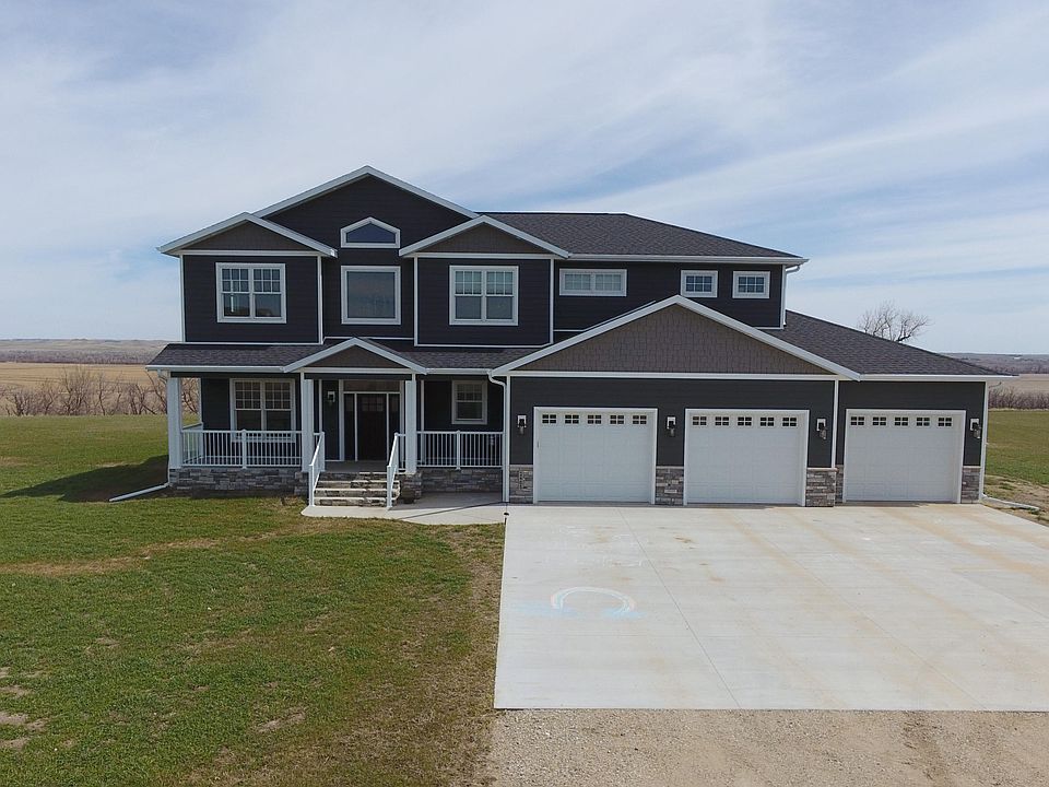 Looking for lots of space plus a view? This gorgeous fully finished 2 story home offers a charming front porch with pillars, style and space. The home is located on 4.9 acres overlooking the gorgeous Missouri River Bottoms north of Mandan. The 2 story beamed foyer welcomes you to this impressive quality home built by Pinnacle Homes. There is a main floor office with French doors off the foyer. The kitchen offers beautiful cabinets, huge pantry, island, granite, farm sink, & gas range. The great room has a gas fireplace. There is a covered patio overlooking the river bottoms. There is a Huge mudroom with a boot bench and hooks plus a 1/2 bath just off the HUGE 1484 sq ft garage. Upstairs are 4 large bedrooms including the master with quartz counter and dual sinks, tile shower and soaking tub. There is a huge walk in closet. The laundry is conveniently located upstairs. The lower level has a family room with stone, gas fireplace. There is an additional BR with walk in closet. The siding is cement board, there is 3 zone heating, air bear, humidifier and reverse osmosis system. This gorgeous, quality home appraised at $724,000 2 years ago after it was built.
