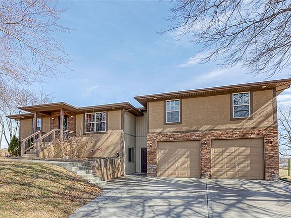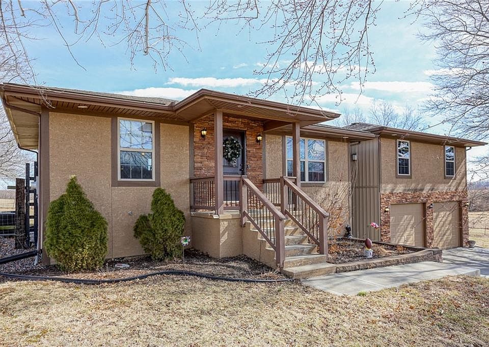 Absolutely stunning raised ranch home on 1 acre just outside of city limits! This home was entirely rebuilt in 2009 and now offers an open, modern floorplan with a gorgeous, private view. The kitchen with hardwood floors & custom cabinets opens to the living and dining rooms, making this a perfect space for entertaining. The large main floor master suite features a fireplace, HUGE walk-in closet, double vanity, whirlpool tub & shower. The lower level includes a rec room space, 2 additional bedrooms, full bathroom, and laundry room. The basement walks out to your 2 car garage. The deck overlooks fenced in backyard with play set, fresh, established asparagus in the garden, and a beautiful pecan tree that produces buckets of pecans each year. The home sits on an acre surrounded by pastures, so you get that country feel and quiet that you've been looking for. All while being conveniently close to any amenities you might need and in the Fort Osage school district.