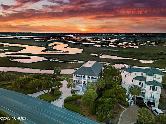 acres of verdant salt marsh. On most days of the year, you might have the place to yourself, magical and eerily deserted, except of course for the hundreds of birds of various species, the shy marsh rabbits, the regal osprey, the noble horned owl, and the hardworking racoons in search of shellfish for dinner. This four bedroom, four bath house enjoys everything a beach home can offer. Exterior decks abound offering ocean to sound views and some of the best sunrises and sunsets around, not to mention the cooling sea breezes of summer. Most every room in the home has water views. The main level boast hardwood flooring, a spacious kitchen with an abundance of counter space and cabinetry, and a generous dining area and family room that will accommodate large gatherings. The top level includes flex space for guests to spread out. A circular drive facilitates multiple vehicles. The fully enclosed garage provides exceptional storage for everything required to live the coastal lifestyle: paddleboards, fishing gear, surfboards, kayaks, beach cruisers, umbrellas, and chairs. A white sandy beach and crystal blue water are just outside your front door. Bring your surf rod if you want to catch dinner. Or just sit there and soak it all in. Either way, you will be enjoying one of the best coastal vistas Wilmington has to offer.