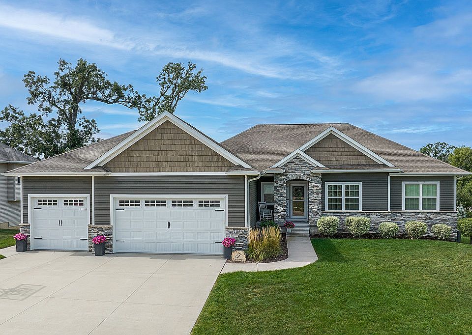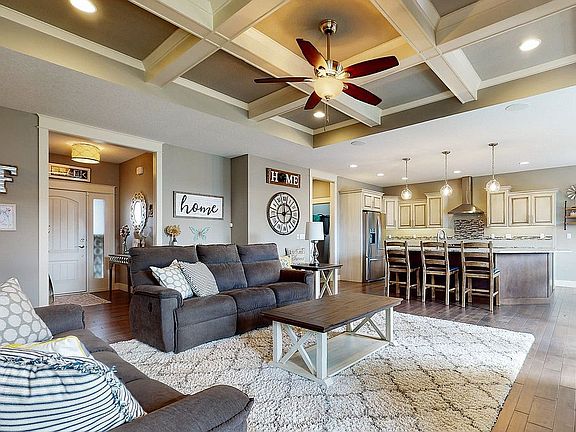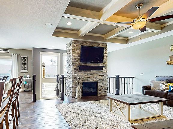 This custom built ranch with curb appeal is located on a quiet cul-de-sac. The main level has hardwood floors, coffered ceiling, features a gas fireplace, ceiling speakers in great room, wired for security system, and roughed in central vac. Also on the main level are 3 bedrooms, 2 full baths, a half bath and laundry. The kitchen features hardwood floors, granite counters, tiled backsplash, stainless steel appliances, soft close cabinets/drawers, dove tail drawers, and pantry. Kitchen appliances stay with the home. The master bedroom is located on the main level and features carpet floors, lighted tray ceiling with triple stack crown molding, and walk-in closet. The attached master bath includes tile floors, marble counters, jetted tub and over-sized tiled shower with rain head. The finished lower level features a gas fireplace, 2 bedrooms, full bath, wired surround sound, workout/bar area, storm shelter, and large storage area with shelving. The heated 3 stall garage has an oversized 3rd stall with loft shelving. Outside you'll find a 14 x14 deck with outdoor speakers, patio overlooking the yard with fire pit and sitting wall, and hot tub (negotiable).
