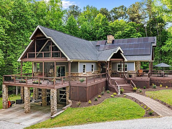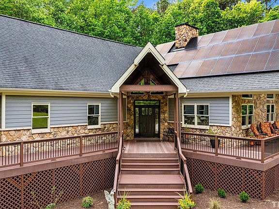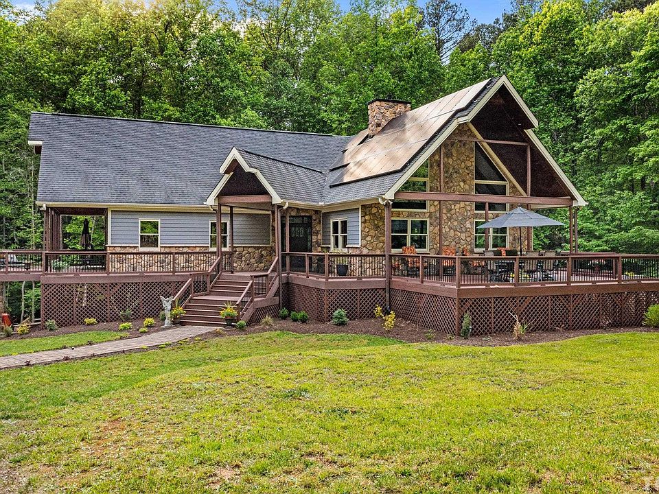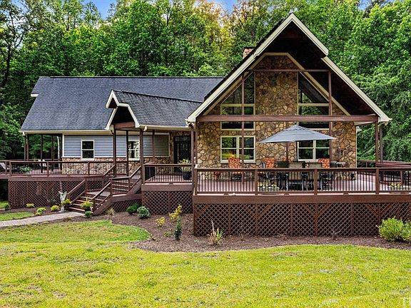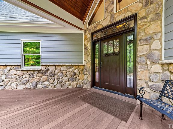 Rustic, modernist craftsman! 3 idyllic acres w/ wooded vistas. Falls Lake area featuring; spacious rooms. Grand 19 ft. high stone fireplace, beam ceilings, granite countertops, built-in appliances, sunroom/office & tile bathrooms. Huge 20' owner's suite, lux bath, large w/in closet. Beautiful custom hickory cabinetry, trim & wood stairs. Hardwood floors! 50k in solar panels & battery backup Tesla Powerwall! 2 bay SUV garage. 240-volt outlet in garage for EV, wrap around deck, 16x12 out building. No HOA!