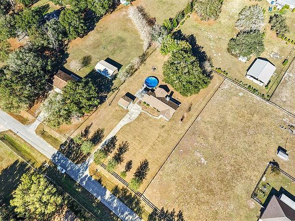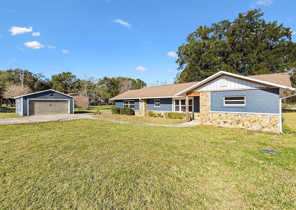 Adorably updated BLOCK-BUILT 3 bedroom, 2 bath home resting on OVER AN ACRE of prime Florida land, featuring a newly built detached two-car garage and an extensive upgraded glass window package throughout. Equipped with a private well and septic system, both recently inspected, this property offers room to breathe, grow, and enjoy true Florida living. Conveniently located just minutes from The Villages and Ocala, one of the fastest-growing cities in the country, this home provides the ideal balance of privacy, space, and accessibility. Fully fenced and situated at the end of a quiet dead-end street, the property offers excellent privacy and flexibility for outdoor living, pets, and gatherings. With over an acre of usable land, there is ample space for animals, hobbies, or simply more freedom than typical subdivision living. The newly built detached two-car garage adds valuable flexibility for storage, workshop use, or recreational equipment. The home features attractive architectural details inside and out, upgraded glass windows throughout that enhance natural light and overall comfort, and ceramic plank tile flooring across the entire home. There is no carpet. The family room includes a real wood-burning fireplace, skylight, crown molding, and large upgraded windows, and opens to a spacious deck ideal for entertaining. Outdoors, a large above-ground pool creates the perfect setting for relaxing or hosting friends and family. The kitchen offers granite countertops, upgraded stainless steel appliances, an oversized refrigerator space, and a large walk-in pantry with sliding barn door. A large upgraded window overlooks the expansive front yard, providing excellent sightlines and abundant natural light. The refrigerator space is intentionally left open, allowing the next owner to select the refrigerator that best fits their lifestyle. The dining room features a bay window with built-in bench seating. The guest bathroom has been beautifully remodeled and includes a zero-entry tiled shower. Major updates include a 4-ton, 14 SEER HVAC system installed in 2022, pairing well with the upgraded window package for year-round comfort. The private well and septic system were both inspected in July 2025 with no reported issues. Additional features include a water softening and purification system, ceiling fans and updated lighting throughout, and a 30-amp RV hookup. With generous acreage, upgraded windows, and flexible garage space, this property offers a rare opportunity in a highly convenient location.