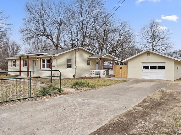 Welcome to this charming 3-bedroom, 1-bathroom home nestled on nearly 2 acres of peaceful Springfield, MO countryside. Offering a perfect blend of comfort, functionality, and outdoor potential, this property is an absolute gem. As you approach the home, you'll be greeted by a wraparound covered porch and an expansive back deck--ideal for relaxing or entertaining while enjoying the beautiful natural surroundings. The home itself has been thoughtfully updated, including new carpeting, LVP flooring, and recessed lighting throughout. The spacious living room is perfect for family gatherings, while the formal dining room boasts a vaulted ceiling, creating an inviting atmosphere. The kitchen has been modernized with white cabinetry, a tile backsplash, stainless steel sink, new gas range, and dishwasher--everything you need to make cooking a joy. A handy pantry off the kitchen adds even more convenience. The updated bathroom features quartz countertops, shiplap walls, tile flooring, and chrome fixtures, offering a stylish retreat. Each of the three generously-sized bedrooms provides ample closet space, with one featuring a walk-in closet and another with double closets. Outside, the property is a true haven. Once a thriving berry farm, it is still home to peach and pecan trees, grapevines, and two sheds. A chicken coop adds to the rural charm, while partial chain-link fencing and a gated driveway provide both privacy and security. The detached single-car garage/shop offers additional storage and workspace, complete with a full bathroom and heating and cooling capabilities. This versatile space could easily serve as a workshop or studio. The cellar, which doubles as a storm shelter, provides extra storage and peace of mind during severe weather. With two private wells, a septic system, and a new roof, this home is ready for low-maintenance living. It's the perfect blend of rural tranquility and modern convenience--schedule your private showing today!