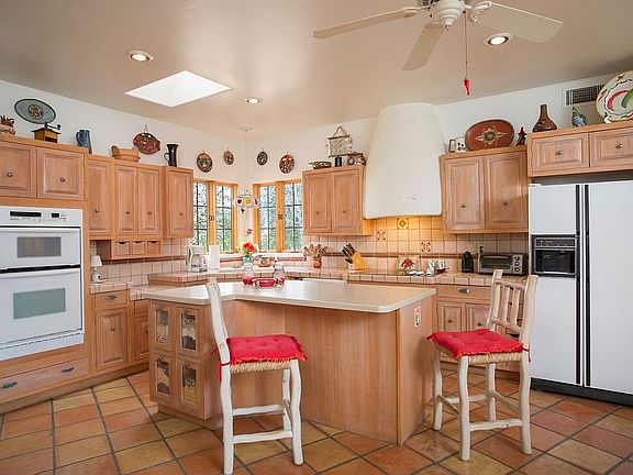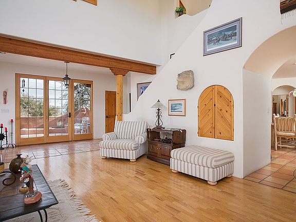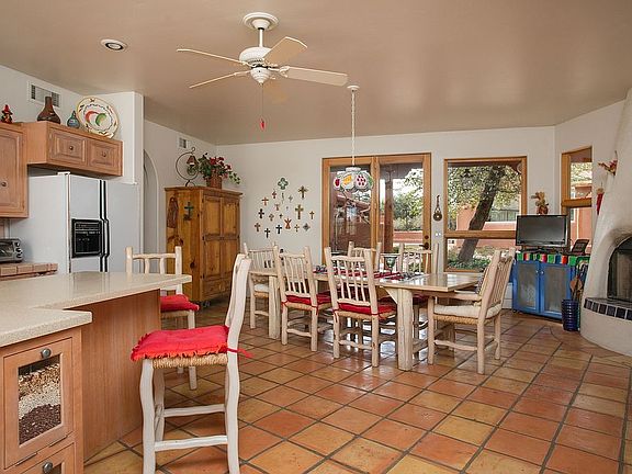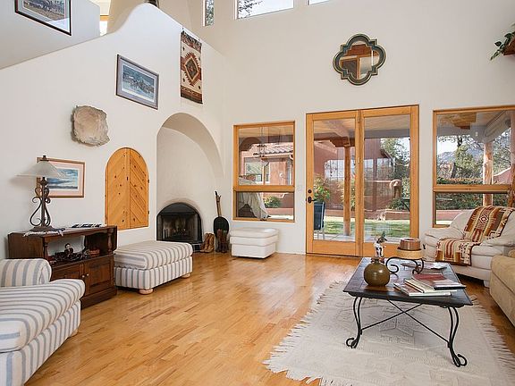 This truly is a Santa Fe beauty that boasts of a main home, guest home and a pool house. Set in the desirable Granite Oaks, this property is located on a two-acre corner home site studded with mature oaks and pines. A wall of windows draws you into the main home with views to the lush back courtyard. The approximately 2970 square foot main house offers three spacious bedroom suites, four fireplaces and three-zoned HVAC. Two master suites are on the main floor and the third bedroom suite includes a loft sitting room is upstairs. A 546 square foot breezeway between the main and guest house. The 1021 square foot guest house features a bedroom, bath, full kitchen, laundry room, separate entry and three covered patios. The pool house is 630 square feet and features a 15' X 17' X 5 1/2' deep pool with a corner spa, solar and propane heaters, kiva fireplace and a 3/4 bath. There are two walls of patio doors that open to extended outside deck area. A spacious walled and wrought-iron fenced courtyard features a lawn, flagstone covered and uncovered patios, yet another kiva fireplace and a built-in barbecue.
