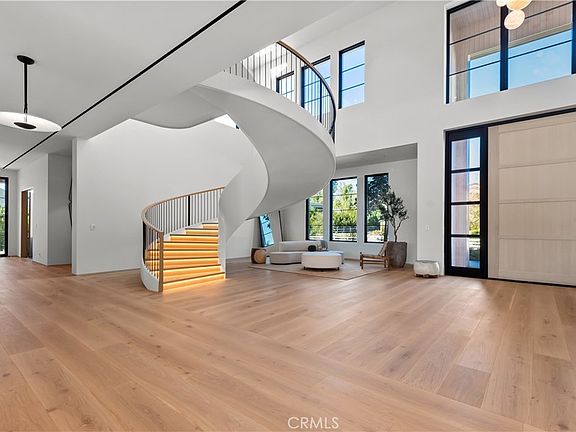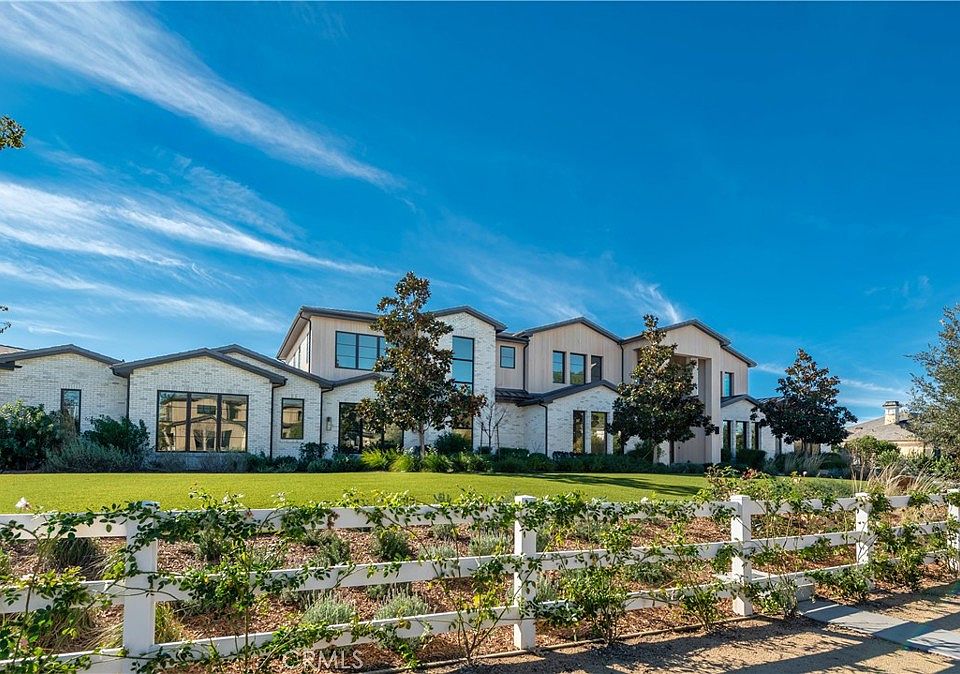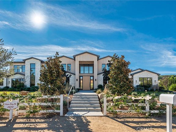 This absolutely gorgeous, new custom estate features beautiful pastoral views, is nestled on a lushly landscaped two acre lot, and is sited at the very end of a scenic cul de sac. The superb open floor plan is flooded with natural light and is highlighted by excellent quality finishes throughout. Amenities include a stellar chef's kitchen (plus a prep kitchen) with four ovens and two islands, one with counter seating, adjoining the sunny breakfast room, all opening to the spacious family room with large stone fireplace and siding walls of glass leading to a large, covered outdoor patio with skylights and full barbecue center. Additional amenities include a gracious formal dining room with glass encased, refrigerated wine wall, beautiful custom office with huge picture windows, a stunning home theater with acoustic paneled sound walls & back-lit coffered ceiling, adjoining entertainers lounge/game room with wet bar, large gym with a motorized opening wall, massage area, and a full bath that includes a steam shower & sauna, plus there is an upstairs bonus room/loft. There are seven generous en suite bedrooms in the main house, four upstairs and two on the main floor. The superb primary suite offers a vaulted, open beam ceiling, full wall windows, white oak floors, a stone fireplace, deluxe dual baths with a shared, oversize walk-in shower, a big soaking tub, room sized, glass fronted custom closets and a big sitting balcony capturing the sunset views. The nicely private grounds include a full guest house, a big sparkling zero edge pool with oversized Baja shelf, a large spa, covered patio, mature trees, and a big private yard with lot's of grass & play areas, plus garages for 7-cars finished with gleaming epoxy floors, plus there is additional off street covered parking. This luxurious home exemplifies the essence of the relaxed, indoor/outdoor California lifestyle.