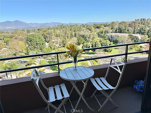 Must See. Stunning Mountain and City Views day and night from every room! Most desirable, Model C (the largest unit) at The Towers, where you can enjoy luxury, resort-style living. Unique waterproof, engineered-hardwood floors throughout in a beautiful pale beach color. Expanded white kitchen with lots of drawers, gold-colored hardware and pull-down faucet, additional electrical plugs under cabinets to accommodate all your appliances. Premiere refrigerator, bottom freezer with drawers and "door open" alarm. Enjoy your morning breakfast at the Bistro table and chairs on your private balcony. 2 bedrooms, 2 baths approximately 1200 sq feet. Huge open concept living room, dining room and kitchen. Very large master bedroom can accommodate a king-size bed and still have room for a desk or sitting area. Wall of glass with sliding doors in bedrooms and living room insure every-changing views from each room. Primary bedroom with walk-in closet and dressing area with golden faucet and hardware. The second bedroom features a wall-to-wall closet. Really lovely, much loved home. Homeowners fee includes monthly points for meals that can be used for breakfast, lunch or dinner at either of the two restaurants; maid service twice a month; utilities except phone; basic cable; on-premise movies; live entertainment and discussions; special holiday events; library; TV room; 3 fireplace social areas; ping pong; puzzle room, bingo, card room, craft facilities; fitness and balance, and other classes plus reception desk with guest screening and bus service. Internet is available. All this plus you can enjoy all the other Laguna Woods amenities including 2 golf courses with low-tee fees, 5 swimming pools, 4 spa/hot tubs, 3 fitness centers, tennis, bocce ball, pickleball, basketball, billiards, garden center, horse back riding/stables and riding classes, Performing Arts Cente, and over 200 clubs One resident must be 55+ to live in this guard-gated senior community. Live the active life you've dreamed of surrounded by beautiful clean green grounds and flowering plants and trees with 'oodles' of social opportunities and you are approximately 15 to 25 minutes to the beach depending on the time of year.