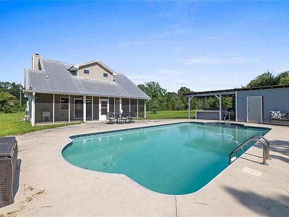WELCOME TO YOUR SECLUDED OASIS, THIS HOME IS NESTLED BACK ON 4.66 ACRES FULLY FENCED W/ GATED ENTRY FOR THE ULTIMATE PRIVACY. FEATURES 3 BEDROOMS 2 BATHS PLUS A 1/2 BATH OFF SCREENED IN PATIO. PRIMARY BEDROOM IS DOWNSTAIRS W/ TWO CLOSETS. OPEN CONCEPT LIVING W/ FIREPLACE. THE KITCHEN AREA HAS A LARGE ISLAND FOR AMPLE SEATING & SS APPLIANCES. THE PRIVATE OUTDOOR OASIS OF YOUR DREAMS W/ AN AMAZING POOL & HANGOUT UNDER THE COVERED OUTDOOR KITCHEN AREA & BAR, POOL SHED W/ STORAGE. THE BARN SHED FOR EXTRA STORGE. X FLOOD ZONE.