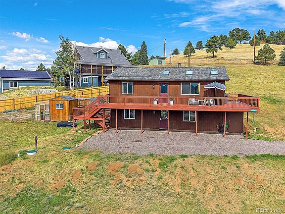 Remodeled to perfection! Welcome to this beautiful raised ranch on 1.07 usable acres overlooking 770 acres of open space. With sweeping views from both levels and sunny southern exposure. The wrap around deck leads to the main level which opens to the great room with spotless engineered hardwood floors. Cozy Woodsman Stove in a stack stone surround. Vaulted ceilings with skylights and expansive dual pane windows that fill with those views. The kitchen is all "wow!" Custom cabinets with pull-outs and soft close. Gorgeous slab granite countertops and custom backsplash. Under cabinet lighting, designer fixtures and stainless steel appliances. On to the remodeled full bath with heated floors, raised vanity and marble surrounds. The primary bedroom and 2nd bedroom complete the main level. The walk-out lower level is light and bright. Featuring a spacious family room and office nook. 2nd remodeled full bath. Laundry room with LG washer and dryer. 3rd bedroom with a murphy bed. And the 4th bedroom with built-in cabinets that makes a great office if a bedroom is not needed. Outside enjoy the usable fenced acreage with plenty of room to park. Storage shed, green house, chicken coop, wood shed and garden beds! OTHER FEATURES & INFO! New Architectural Shingle Roof & skylights on house and sheds 2023. New hot water heater 2022. New dual pane windows, hardwood floors, doors, kitchen and bath remodels 2018. Underground Comcast Cable installed 2018. New Septic Tank 2017. The list goes on! The owners have loved and cared for this property and it shows. All the work done on this home, they did for themselves using the highest quality materials and attention to detail. It's a gem! This property includes two parcels making up the 1.07 acres. Excellent Indian Hills location. Just up the road from Parmelee Elementary. Minutes to Hwy 285 or Hwy 74. This is the one you've been waiting for!