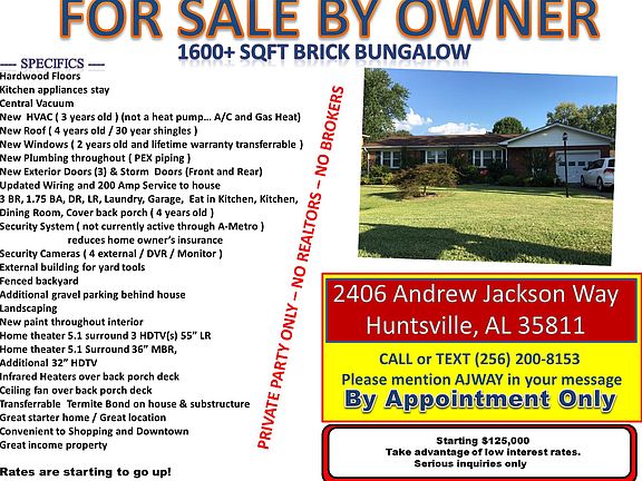 I can easily show the house if given at least a 30 minute notice. Hardwood Floors Kitchen appliances stay Central Vacuum New HVAC ( 3 years old ) (not a heat pump… A/C and Gas Heat) New Roof ( 4 years old / 30 year shingles ) New Windows ( 2 years old and lifetime transferrable warranty) New Plumbing throughout ( PEX piping ) Updated Wiring increased Electrical service from 100 to 200 Amps 3 BR, 1.75 BA, DR, LR, Laundry, Garage, Eat in Kitchen, Kitchen, Dining Room, Cover back porch ( 4 years old ) Security System ( not currently active through A-Metro ) reduces home owner’s insurance Security Cameras ( 4 external / DVR / Monitor ) External building for yard tools Fenced backyard Additional gravel parking behind house Landscaping New paint throughout interior Home theater 5.1 surround 3 HDTV(s) 55” LR Home theater 5.1 Surround 36” MBR, Additional 32” HDTV External HDTV antenna (with built-in rotor) Trek FM Antenna mounted in the attic Infrared Heaters over back porch deck Ceiling fan over back porch deck Transferable Termite Bond on house & substructure Great starter home / Great location Convenient to Shopping and Downtown Great income property (rent would far exceed house payments) RATES APPEAR TO BE STEADILY GOING UP Reasonable offers considered as well...
