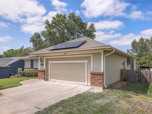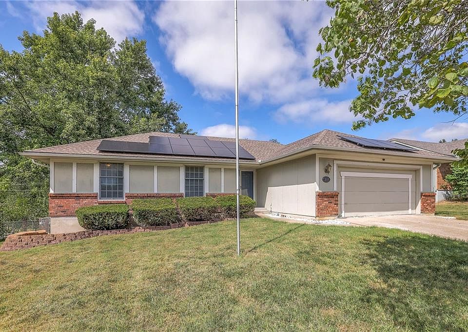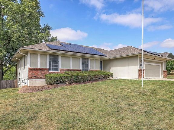 Welcome home to this well-maintained ranch in Harrisonville! This home offers single-level living with three bedrooms and three baths, a fully finished basement with two extra non-conforming bedrooms, and a two-car garage. Situated on a quiet cul-de-sac, the house has solar panels, keeping the monthly electricity bill to an average of just $10-20. The living room features beautiful beamed ceilings, hardwood floors, plenty of windows for natural light, and a gas fireplace. The eat-in kitchen includes bay windows, bright cabinetry, granite countertops, stainless steel appliances, and a pantry. The master bedroom is a peaceful retreat with a tray ceiling, ceiling fan, crown molding, and a master ensuite with a new tile shower, tile floors, and a glass enclosure. The master bedroom also provides access to a private deck, perfect for enjoying morning coffee. Convenience is key, with main-level laundry in the hallway and large windows and ceiling fans in all bedrooms. The fully-finished basement is light and bright, featuring a ceiling fan, built-in shelving, a family or game room, a bathroom, and two additional non-conforming bedrooms with new carpet. The dream backyard is fully fenced, offering views of green space where you might glimpse deer. The incredible deck spans the entire back of the home, perfect for summer barbecues and entertaining. A stand-alone shed in the backyard provides additional storage. Don't miss your chance to see this fantastic home today!