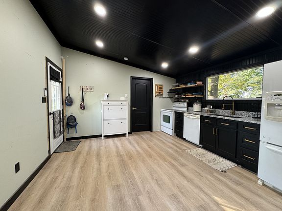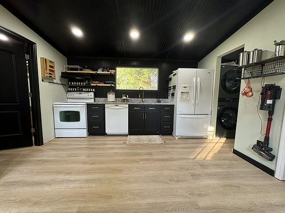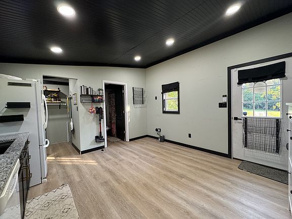 Welcome home to your cozy cabin nestled among mature trees on 6 acres. Enjoy the peaceful view from the picture window in the kitchen. The home boasts granite countertops, separate pantry, laminate vinyl tile throughout, and new paint. All appliances, including washer and dryer, to remain. Located just 8 minutes from town. This quaint home is truly move-in ready.