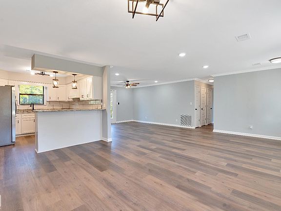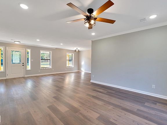 This beautifully remodeled 3-bedroom, 2-bathroom home offers 1,611 sq. ft. of updated living space and sits on a picturesque 1.6-acre corner lot with shared ownership to the pond on the back of the property. Recent updates in 2024 include a new roof, gutters, back deck, modern lighting throughout, fresh paint, new floors, and stylish granite countertops with new cabinet faces. Both bathrooms have been completely updated, and all closets and the pantry are equipped with built-in shelves and rods. The master suite features a his-and-her closet design for ample storage. Step outside to enjoy a brand-new deck, a smooth yard with freshly cut trees, and stunning views. This property also includes 1/4 ownership of a shared pond, adding to the serene outdoor appeal. With incredible curb appeal, modern finishes, and thoughtful updates, this home is truly a must-see! This home is on a septic tank. When built, the city sewer was not offered. Since then, there is now access to the city sewer if someone wants to pay to have it tapped in.