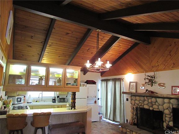 Priced to Sell! This adorable Bavarian in a private tree top setting is the ultimate mountain get away. Enjoy your morning coffee on the private deck surrounded by the blue sky, blue jays and yellow daffodils. All one level with two bedrooms on the main floor. The large rock fireplace is the main focal point in this open concept floor plan. Gorgeous wood beam, vaulted ceilings in every room! Appliances included. Easy commuter location, approximately 20 minutes to the 210 freeway. Located just 8 miles from Lake Arrowhead, 30 minutes from Big Bear. Sky Park Santa's Village is now open and just 15 minutes away.