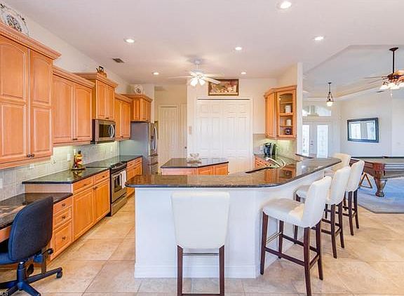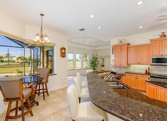 Luxurious Paul Lambert custom built executive home in Burnt Store Lakes. This 3 bedroom plus den, 2 1/2 bath, 3 car garage, pool and spa home with 2,611 SF of living area. Spacious family room with double coffered ceiling detail with lighting, light and bright with several windows overlooking the lake. The kitchen boast stainless steel appliances, oversized pantry, granite countrertops and solid wood cabinetry with large breakfast bar and center island. 20" tile throughout all main living areas. Master suite boasts coffered ceiling details, two custom California walk-in closets, french doors leading to screened in lanai. Master bathroom with his and hers vanities with Travertine countertops, walk-in shower and whirlpool tub. Home is fully protected with PGT hurricane windows and shutters along with a Generac backup generator that operates the entire home. Prewired Bose surround sound system, pool and spa are heated by solar panels. Upgraded trim package and Moen plumbing fixtures. 3 Zoned Ac unit replaced in 2016 with 10 year warranty. This home is a must see!