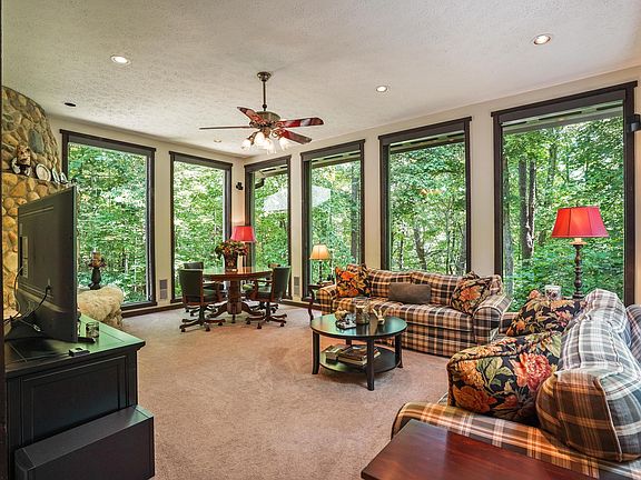 Breathtaking Hocking Hills beauty greets you as you drive down the gated lane. In a prime Chapel Ridge Rd location, this property features magnificent views from a wall of windows, the deck, hot tub and 4-season enclosed porch. The classic design quality can be yours to move in and enjoy as a primary home or retreat Including ALL APPLIANCES & MOST FURNISHINGS . The ranch style home has a full unfinished basement that can add living area with walk out potential from the ''workshop'' space. A stocked pond features a fountain and can be enjoyed from the dock or inside the screened fish house. Trails lead you to outdoor recreation areas with fire ring, zip line and swings or through the ravine to the gorge with 60' rock face and waterfall. There is an attached garage and ample parking.