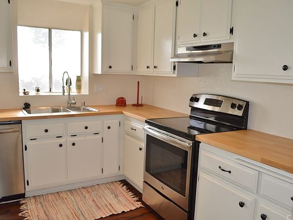 WOW - Beautiful 1-level home with 3 bedrooms, 2 baths, 1570 square feet and a 3 car garage. Open floor plan offering a spacious living room with vaulted ceilings and a gorgeous stack stone fireplace with mantel and hearth. Light and bright kitchen with white cabinets, butcher block counters, stainless appliances, deep sink, newer faucet, and greenhouse window. Kitchen opens up to the dining area with ceiling fan and access to the backyard. Master suite with ceiling fan, mirrored closet doors, and elegant master bath with stone counters. Two spacious guest bedrooms (1 with built-ins) and guest bath with stone counter tops. Neutral paint and upgraded neutral carpeting throughout. Newer windows and doors. Detached 3 car garage with vaulted ceilings and a 2nd door that leads to the backyard. Large landscaped backyard with mountain views. Flat lot and driveway. Completely turnkey and ready for move-in.