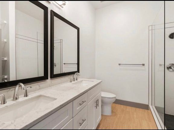 AVAILABLE NOW 8 South/Melrose and top floor unit! Like new, this two bedroom, two bath offers an open floor plan, white kitchen with quartz countertops, hardwoods throughout, tiled baths, and walk in closets. Juliet balcony off kitchen and large balcony off living room. Two designated parking spaces and dog park on site. Elevator to all floors and secure building!