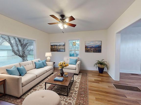This 2-bedroom, 1-bath home is thoughtfully remodeled with a layout that maximizes space, ensuring all areas feel spacious. The home features a brand-new roof, gutters, windows, and siding. The interior boasts updated flooring, light fixtures, and a modern kitchen with new fresh cabinets and countertops. The beautifully updated bathroom includes a gorgeous shower. Additional upgrades include a new deck, front porch, and new concrete in the attached garage. The spacious, fenced-in backyard offers plenty of outdoor space.