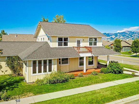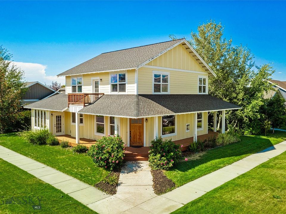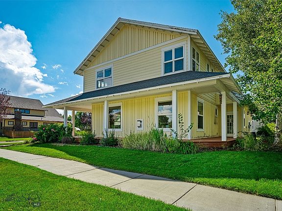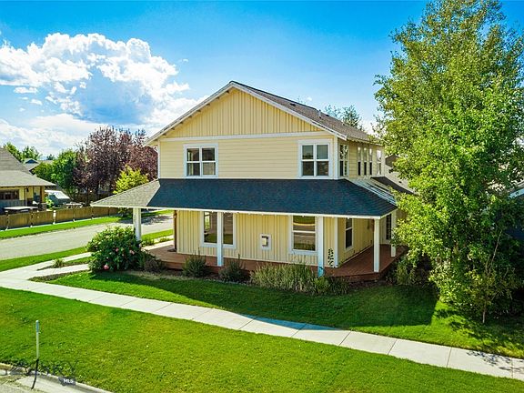 The gracious wrap around front porch sets the stage for this charming farmhouse style home that needs some TLC to shine. A great main floor layout is anchored by a gas fireplace in the living room and huge south facing windows that capture lots of natural light. The spacious kitchen separates the living and dining for a traditional but very open floorplan. A main floor bedroom has private access to the hall bath and would function well as either a bedroom or an office. Highlights on the main include composite sink, bay window in kitchen, hardwood floors in living and dining rooms. Upstairs the primary suite is large with ample closet space and a wonderful master bath with separate vanities, large soaker tub and 2 headed tile shower. Great views can be enjoyed on south balcony and from the east facing windows. Accessory bedrooms have a unique jack and jill bath design with individual vanities in each bedroom. A side load oversize double garage is accessed from large laundry/ mudroom. Centrally located in Bozeman, close to Chief Joseph Middle School, Gallatin High School and numerous parks and trails. 2407 Ferguson is an ideal property for someone looking to build some sweat equity and bring out its inherent charm.