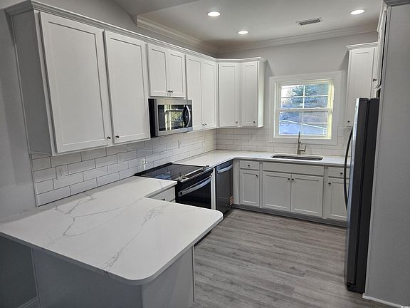 3BR raised beach house walking / golf cart distance to Cherry Grove Beach. New construction and just completed - open layout with vaulted ceiling in great room - kitchen features white cabinets / quartz countertops and stainless appliances - master suite to one side with walk in closet, double vanity and tiled walk in shower - both guest suites on opposite side of the house with shared hall bath with tub / shower. Laundry room with wall cabinets - Front porch and plenty of sitting / hang out space under the home as well as oversized one car garage.