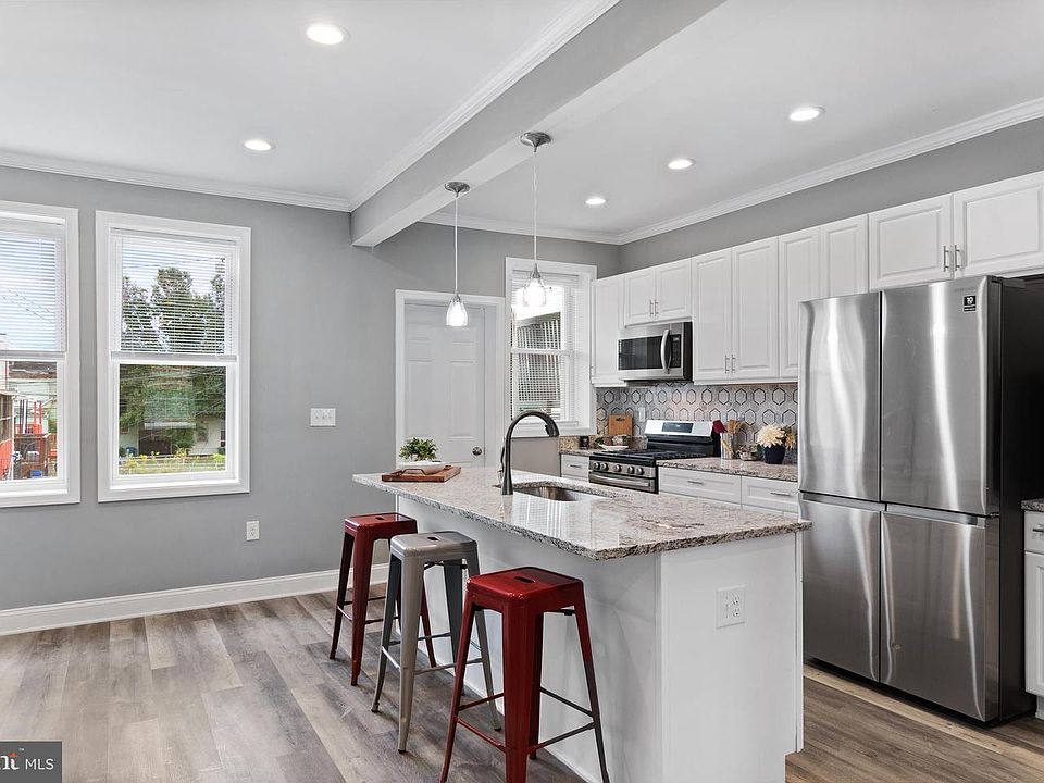 Wonderful price reduction. TOTAL RENOVATION!! Beautiful 4 bedroom, 2.5 bathrooms, with open floor plan. Gorgeous kitchen has lovely island with pendent lighting, stainless steel appliances, upgraded countertops, quiet close cabinets. Recessed lighting throughout the home. Upper level has primary plus two additional bedrooms. and beautiful full bath. Ceiling fans in every bedroom. Lower level has an additional room which could be an office or a bedroom in addition to space for entertaining. Plenty of storage space! This home is truly made for entertaining and everyday living. WON'T LAST LONG! WELCOME HOME! Please use Covid preventive measures when showing this property. Be in by the holidays! Seller prefers buyer use King Title .
