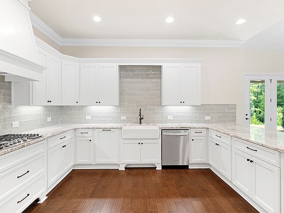 The Cook plan is located in a cul-de-sac that abuts a private, wooded area. The plan offers three main-floor bedrooms, along with a spacious bonus room, 4th bedroom, & full bath on the second floor. The open great room, kitchen, & dining space are the heart of the home. The kitchen features unique granite countertops, a coordinating backsplash, island pendants, a decorative vent hood, & a custom walk-in pantry. A gas fireplace & a wall of windows leading to the covered patio create a lovely gathering space in the living room. Located at the rear of the home, the spacious primary bedroom is a private retreat with hardwood floors. In the bath, an expansive vanity hosts 2 sinks, & a frameless, zero-entry shower has a handy bench. Two additional bedrooms, a second full bath, & a linen closet are tucked into a private hallway. The laundry room near the owner's entry offers a utility sink & cabinetry in a fabulous color. Garage storage is plentiful. Spray foam insulation. JANUARY COMPLETION.