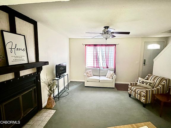 Main level - a cozy living room and wood burning fireplace, a half bath with washer and dryer, a dining room, and a well-appointed kitchen.