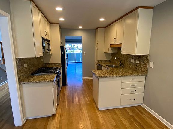 This spacious and upscale condo is conveniently located in the Sharon Heights neighborhood and walking distance to shopping centers, hiking trails, and more. Minutes away from Stanford University, Stanford Shopping Center, and Stanford Medical Center. This condo has three levels. The second level has hardwood floors and features living room, kitchen, dining area, and 1/2 bath. The kitchen has plenty of storage, granite countertops, and stainless steal appliances including: gas range, built in microwave, refrigerator and dishwasher. The living room is large with 2 sliding glass doors that open up to a private balcony with access to a large grass field in the middle of the complex. Recessed lighting throughout 2nd level and stairwell/hallway to third floor. The third level features all 3 bedrooms with abundant natural light and 2 full bathrooms. The upstairs is fully carpeted and each bedroom has a ceiling fan and large closet. Primary bedroom is a suite with private balcony. The 2 full baths are tastefully updated with new vanity and granite countertops. Comes with an attached 2 car garage and home office on the bottom level. The office is carpeted and features a very large built in desk with abundant storage. The garage can fit 2 cars and has built in storage as well as washer and dryer. The complex features a pool, clubhouse, and large lawn area with tables. Water/ Garbage/ HOA included in rent In unit Washer/Dryer Central Heat and A/C Available April 1st! Pets allowed with additional deposit Renter's Insurance required Rent: $5950.00 Security Deposit: $5950.00