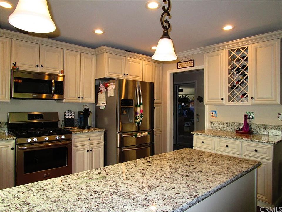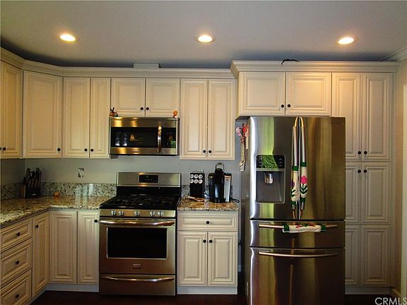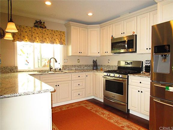 Absolutely model perfect home on a corner lot. Upgraded home with 2 bedrooms plus a den. This is a customized Narciso floor plan. This home has quality detailing and craftsmanship throughout. Recently remodeled throughout. Upgrades include duel pane windows and sliders. Raised panel interior doors with brushed nickel finished hardware, upgraded flooring throughout, solid wood kitchen cabinets with two lazy Susan, soft close drawers, pantry with pull out shelves. Kitchen hutch. Chef quality high BTU 5 burner gas range with convection micro hood, newer dishwasher and granite countertops. Crown molding. Scraped and textured ceilings. Recessed LED lighting. Fireplace with gas starter, marble surround and designer mantle. Hall bathroom with extra large low entry shower, rain shower head, marble flooring and designer tile. Master bath with double vanity and granite countertop, porcelain on steel tub. Newer heating and air conditioning. Large patio with cover and a dog run. Two car attached garage with fire rated pull-down ladder. A beautiful place to call home.