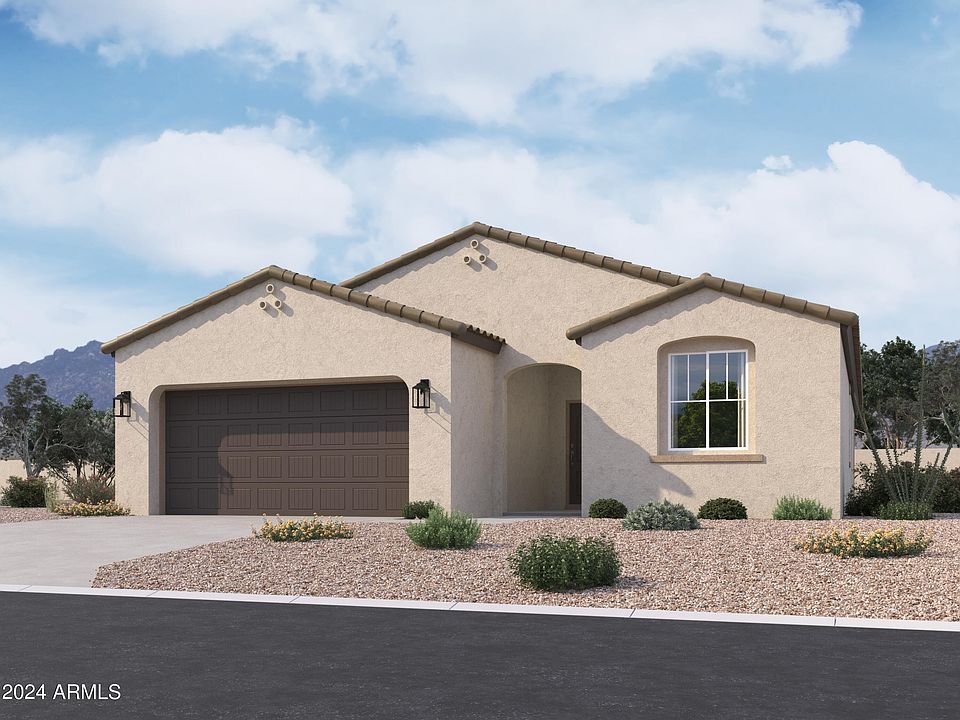 New Home under construction. Estimated completion June 2024. This 1777 sq ft single story home has 3 bedrooms, plus a den and 2 full baths with just the right amount of space. This home has great curb appeal with a tan exterior with dark tone garage to match the desert landscape The split floor plan and open concept is ideal for hosting and entertaining. This home features our Harmony design package that includes quartz kitchen counter tops with a calming white mosaic backsplash, under mount kitchen sink, white painted cabinets, and 6x36 natural plank style tile in all common areas with plush carpet in the bedrooms and den. The kitchen also includes a huge quartz island, walk in pantry and stainless steel appliances, perfect for the cooking enthusiast! The designated dining area has a sliding glass door that leads you to your outdoor patio that can provide an indoor/outdoor living space. The primary room has a spacious walk-in closet, double sinks, large walk-in shower, and an additional linen closet for extra storage. This community will feature a dog park, covered ramadas and basketball court. You do not want to miss this.