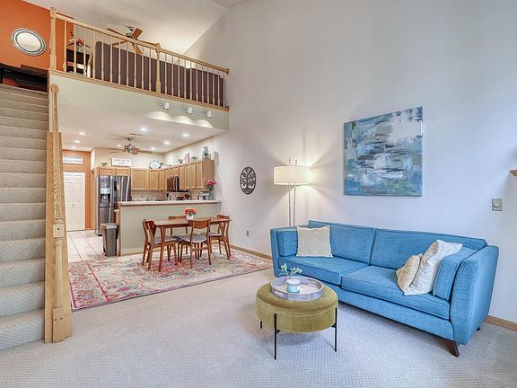 The versatility of this floor plan is fantastic! There are two separate areas that can serve as a primary suite. The main level suite has a spacious bedroom with laminate floors and an abundance of natural light, large walk-in closet and private bath with vanity and CT floors. The open floor plan features a two story great room with corner fireplace, comfortable dining room area and kitchen with raised snack bar, pantry, CT floor and all appliances included. The upper level features two bedrooms, a loft and a full bath which has dual entry off of one of the bedrooms and loft. Some nice updates have already been done: Furnace - 2025, Hot Water Heater - 2021, Roof - 2022 and New Carpet in the great room and stairway - 2025. Enjoy access to the Fox River Trail right outside your front door!
