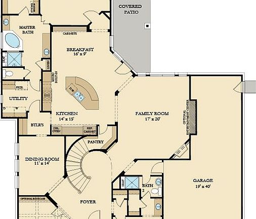 The stunning two-story Chopin plan by Village Builders features an inviting front porch and grand foyer entry, a handsome study with the options to add beautiful ceiling beams and built-ins, formal dining room, a gourmet kitchen with center island, breakfast nook and walk-in pantry, a generous family room with the option to add built-ins, and a spacious covered rear patio. The master bedroom, one of two bedrooms located on the first floor, boasts an en suite bathroom with separate shower and tub, dual sinks, private toilet enclosure, and a large walk-in closet. The second floor features two additional bedrooms, and a game room. The Chopin floor plan includes the options to add a butler's pantry, a fifth bedroom, a media room, and an outdoor grilling area.